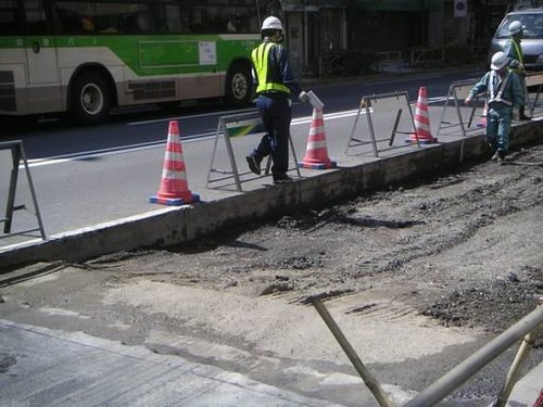 挖完後先是把柏油塊清運走,而不是堆置路旁!注意看那個手上拿著尺的工人(身高約165),底層泥土到柏油路頂端竟然有到他的膝蓋高度I!從頭到尾確認挖的深度...=.= 認真態度令人汗顏!而且,他們都穿工作服唷!當時日本正熱卻也不見人打赤膊...
